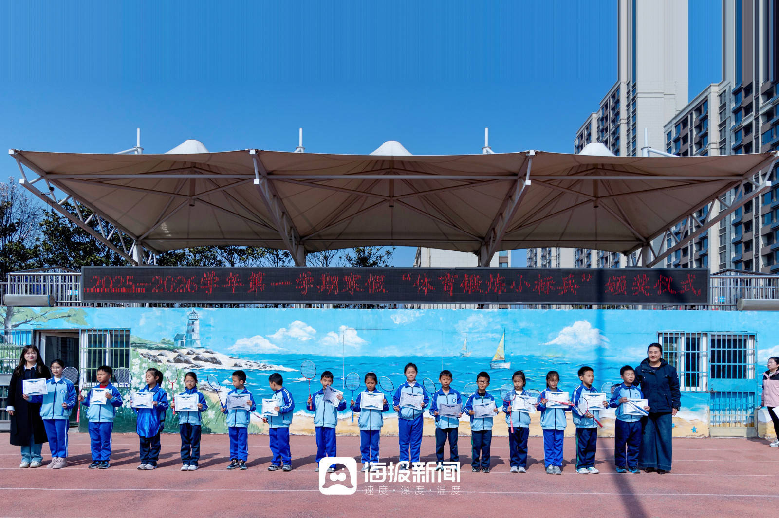 在会后的大课间上,学校还为寒假期间坚持锻炼的“锻炼小标兵”们,举办了简单却仪式感满满的颁奖仪式。当校长亲手将奖状和奖品球拍发给小标兵时,操场上传来了孩子们的欢呼和掌声。