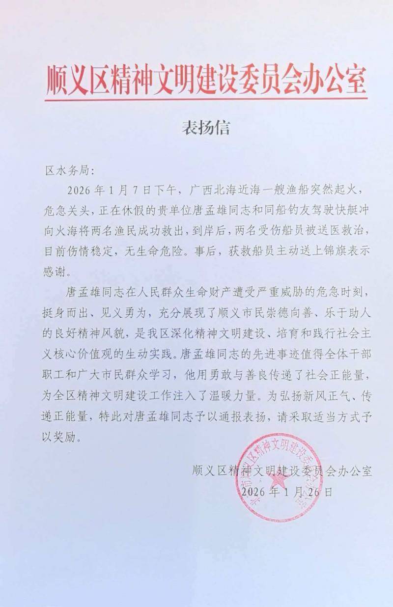 今年1月7日,顺义区水务局温榆河管理段干部唐孟雄在广西北海休假期间,于海上垂钓时突遇一艘渔船爆炸起火。危急关头,他与钓友、快艇驾驶员毫不犹豫展开生死救援,以教科书式的处置成功救出两名被困船员。1月26日下午,为表彰其挺身而出的义举,阿里公益天天正能量联合北京青年报,授予唐孟雄“天天正能量特别奖”,并颁发奖金1万元。顺义区同步向唐孟雄所在单位及其儿子就读的学校寄送表扬信,这也是该区自2023年开展“顺义好风气”建设以来,发出的第4325封表扬信。