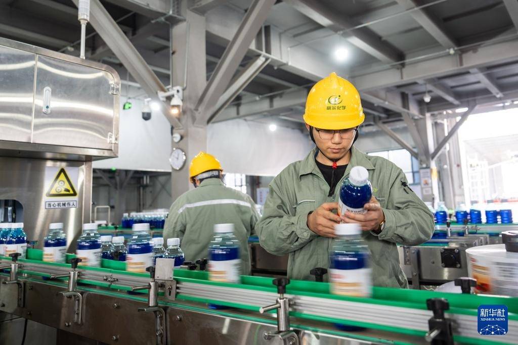 ▲在津市高新区的湖南利尔生物科技有限公司制剂车间,工作人员抽检除草剂成品。(图源:新华社)